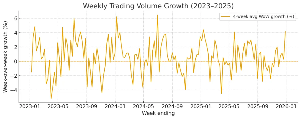 Home » Prediction Markets Are Booming – And They’re Reshaping How We Forecast the Future » Weekly Trading Volume Growth 2023–2025Weekly Trading Volume Growth 2023–2025by Gihan WanninayakeDecember 5, 2025